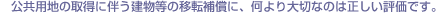 補償部門は、建物を中心とした移転補償、種々の移転の経費に対する補償、営業補償等の収益補償のみならず、これらと密接に関連を持った用地そのものに対する考え方も重要と捉えています。 さらに権利者の日常生活、業務活動の実態についてのきめ細かな調査に基づく幅広い分析も不可欠となり、これらを総合してはじめて公正、適正な結論が求められます。 取得予定地に存する建物、工作物、立竹木等の所有権及び所有権以外の権利者の建物等の用途、構造等の調査のほか移転工法の検討に含めて、的確な判断のもとに適正な補償額の算定に努めています。 補償コンサルタント業務では、官公庁からの依頼を受け、公共事業の施行に必要な土地、建物、庭木等の補償対象物の調査をし、適正な評価及び補償額を算定し、補償内容について地権者に対する説明も行います。 また、公共事業の施工による地盤変動等による家屋の損傷や水枯渇・電波障害等の損失についても、同様に調査・算定・補償説明等も業務の一環として取り組んでいます。